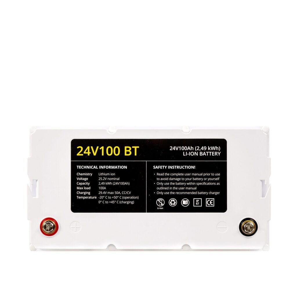 Deze accu is geheel onderhoudsvrij en heeft tot wel 1500 laad-cycli. Dat betekent 1500 keer opladen en weer ontladen. Hij is aanzienlijk lichter dan een vergelijkbare loodaccu en heeft een veel minder jaarlijks verlies. Door het ingebouwde Battery Management System hoef je nooit bang te zijn dat je de accu te diep ontlaadt en daarmee beschadigt. De 24V100 BT  heeft 3 jaar garantie.
