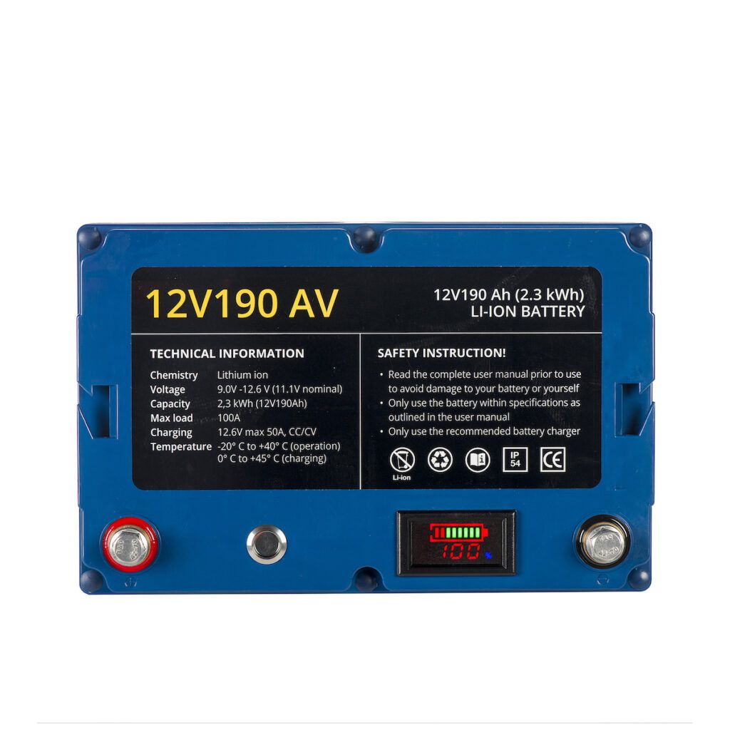 Compact and lightweight 12V190 AV Lithium Battery that runs on 12V and has an output of 190Ah (2.3kWh). This battery is the most powerful and largest battery in the 12V line, but weighs only 12.5Kg! This battery can be used for: