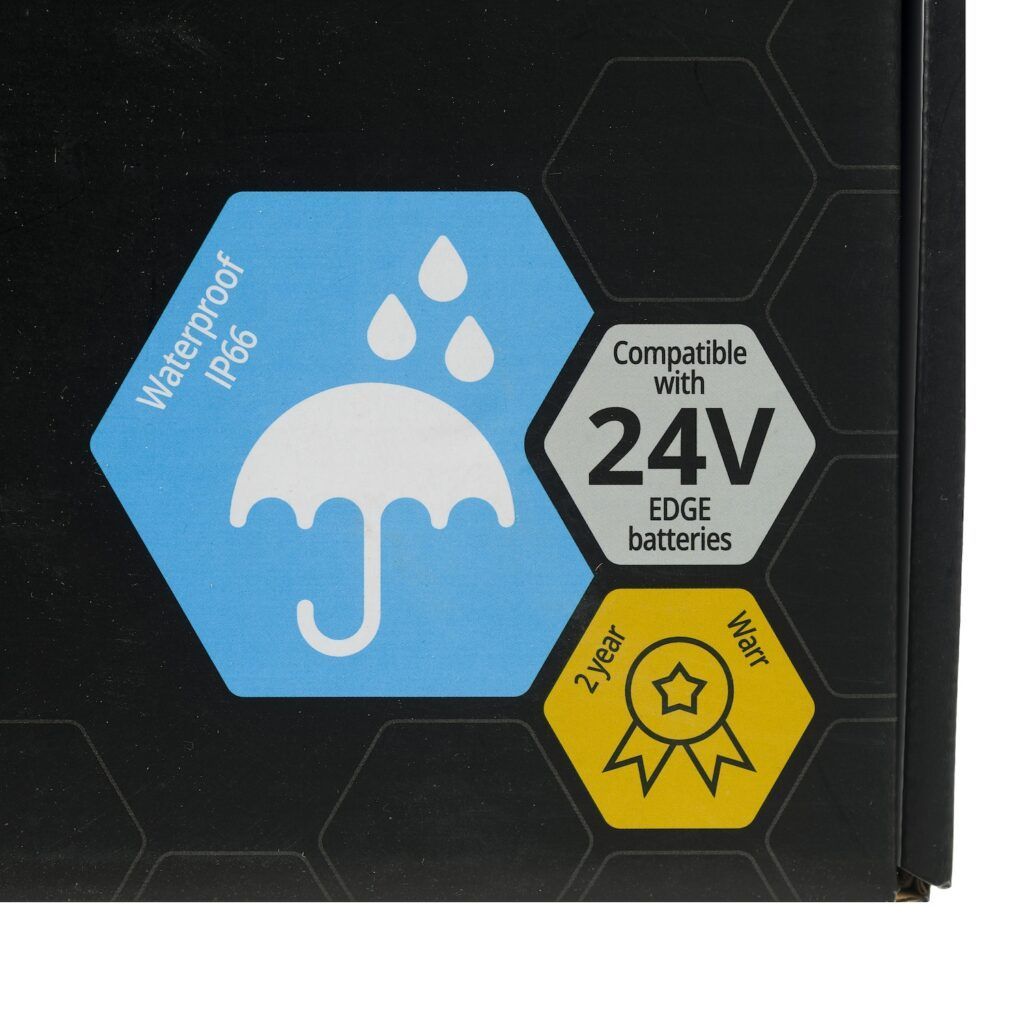 The 29.2V20A LiFePO4 charger waterproof (IP65) has been specially engineered to charge Rebelcell 24V EDGE LiFePO4 batteries. The specially designed charging programme ensures that your battery is charged safely and automatically with the correct charging profile (voltage / charging current). The charger shuts off automatically when the charging process is completed.