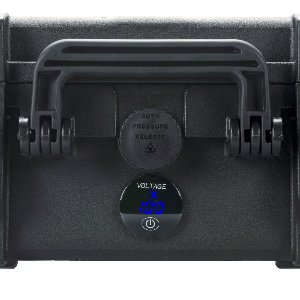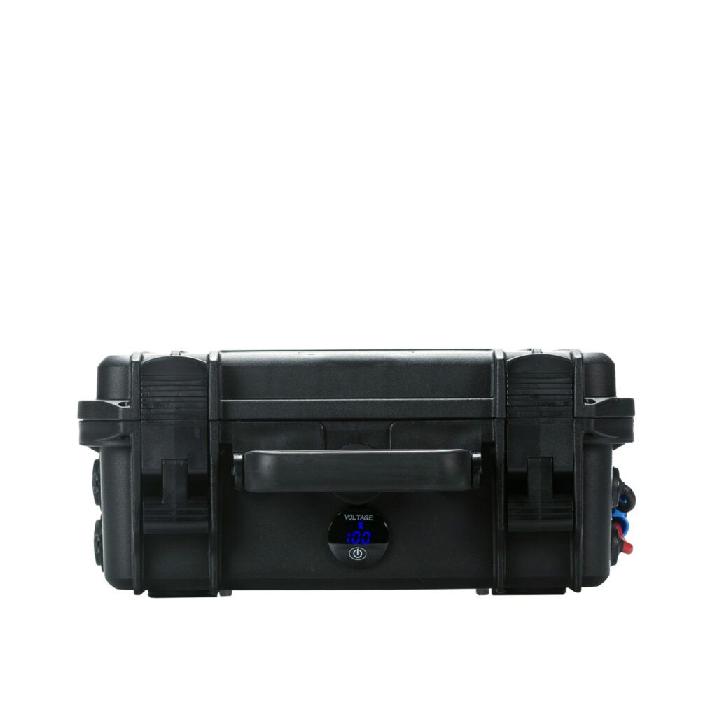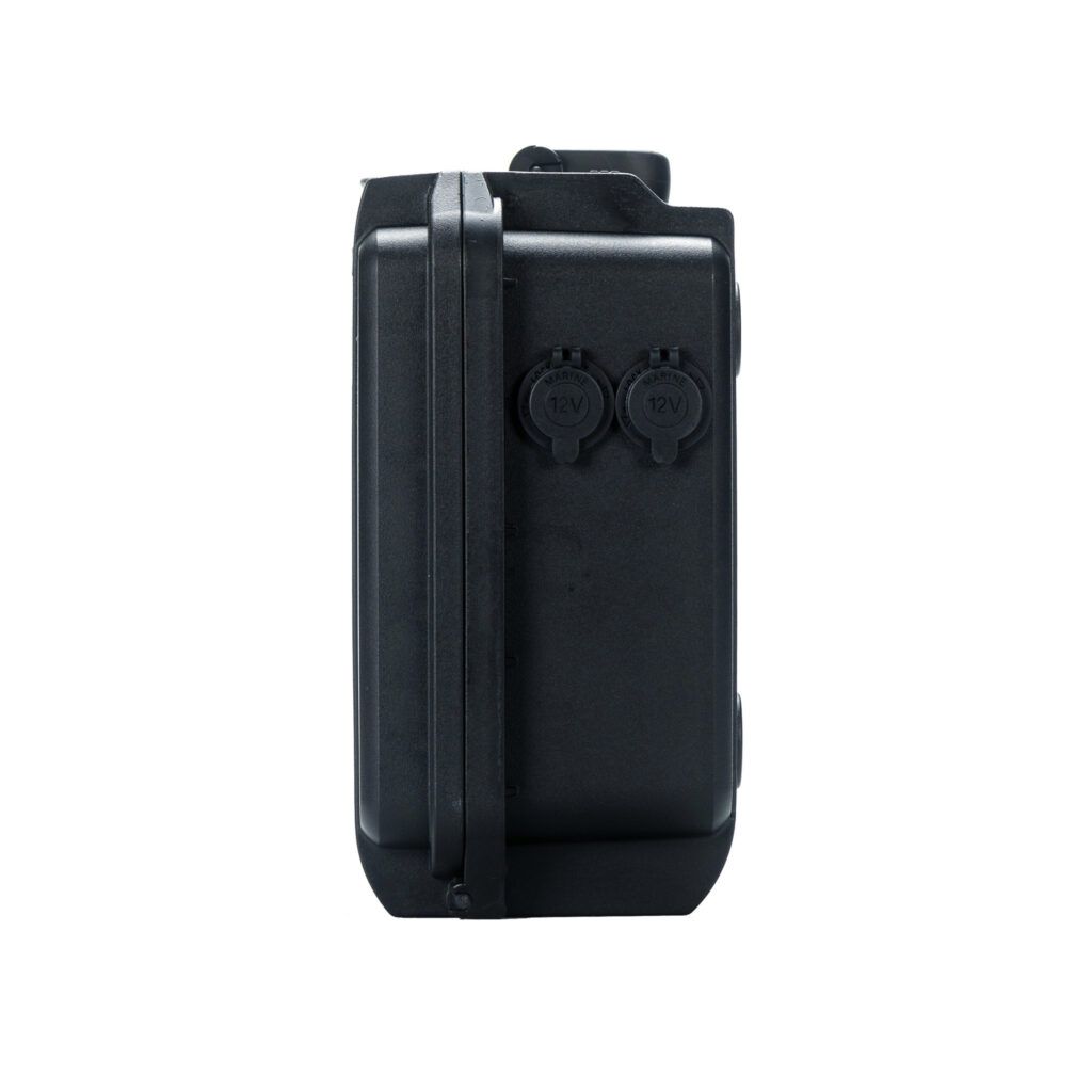 Compact, robust and lightweight Outdoorbox 12.70 AV. Thanks to its robust, impact-resistant and waterproof casing, this Outdoorbox is ideal for use in kayak, belly boat and carp fishing. The 12.70 AV Outdoorbox has an integrated 12V70 Ah lithium battery – 863Wh, weighs only 6.7 Kg and features a digital charge status indicator.